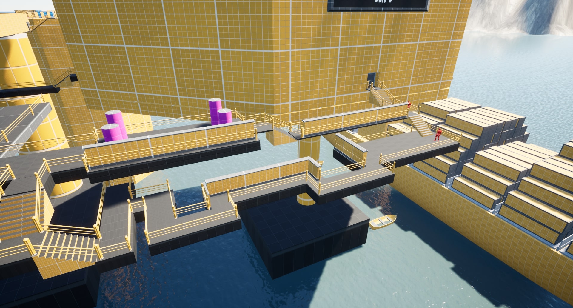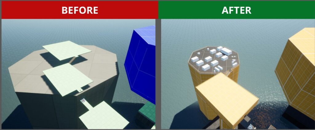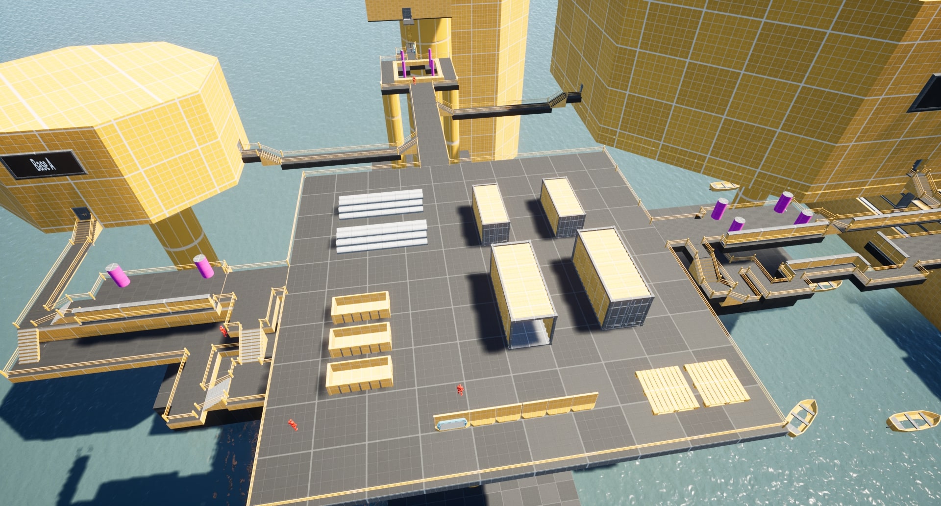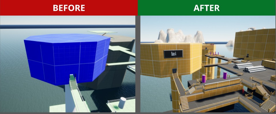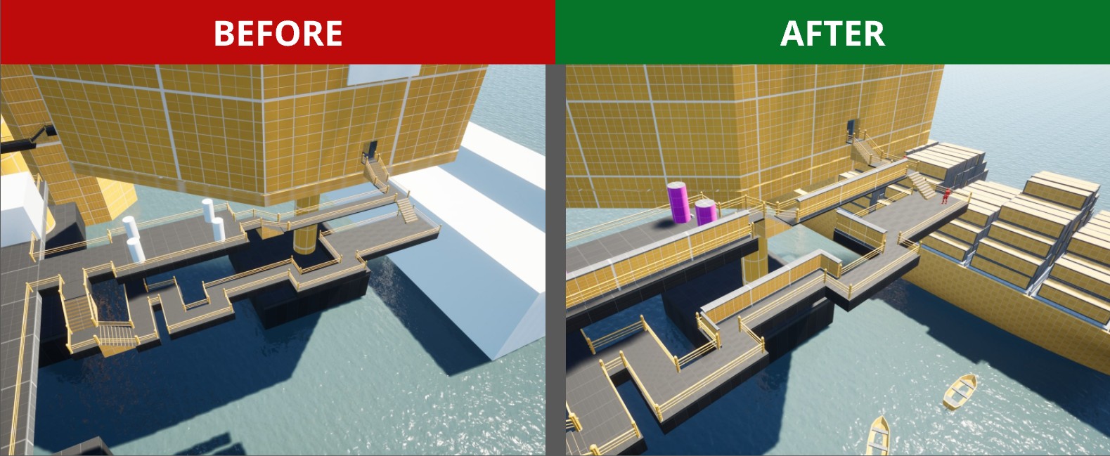 Solution: Added a sidewalk to each path leading to the main bases, increasing both challenge and variety in the objectives.