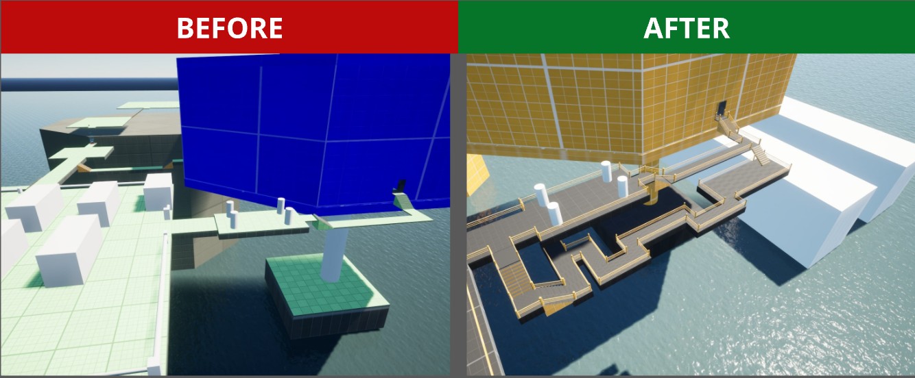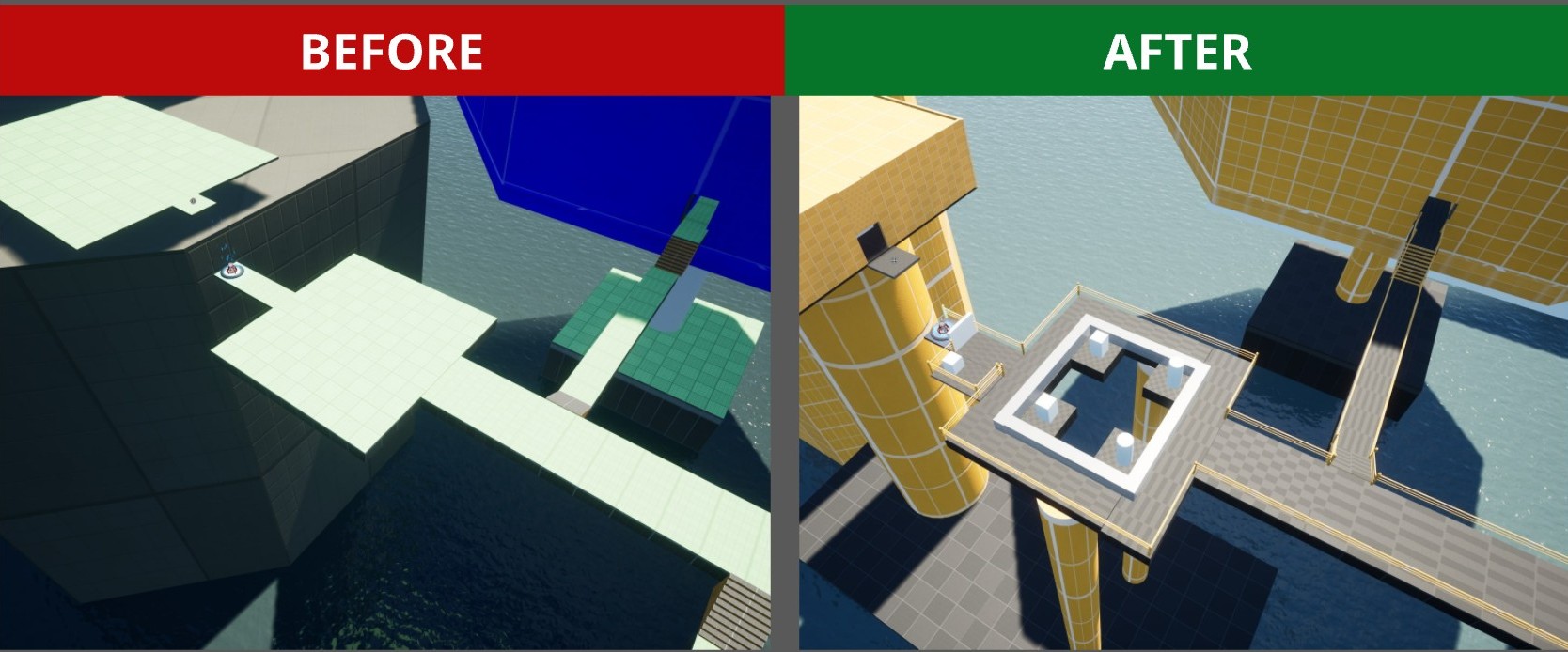 Solution: Replaced much of the basic geometry with more complex level design elements to create a more visually interesting and engaging combat space.