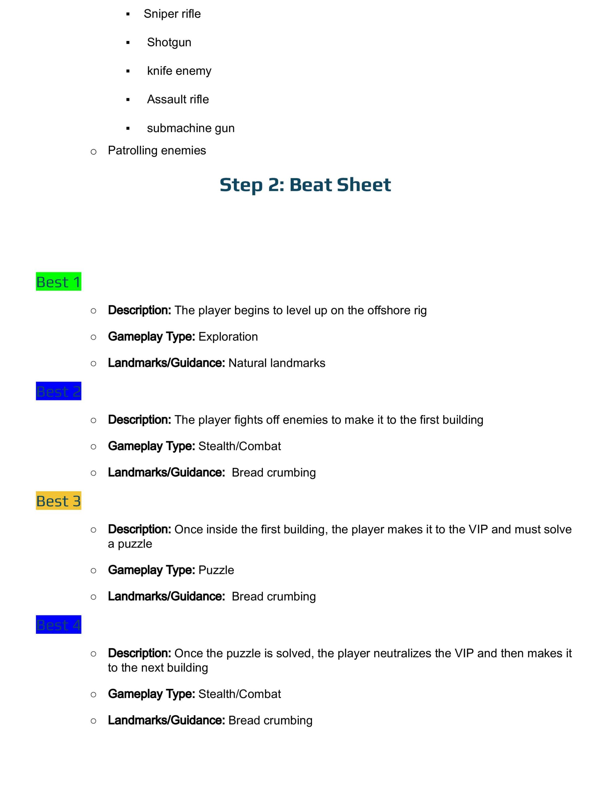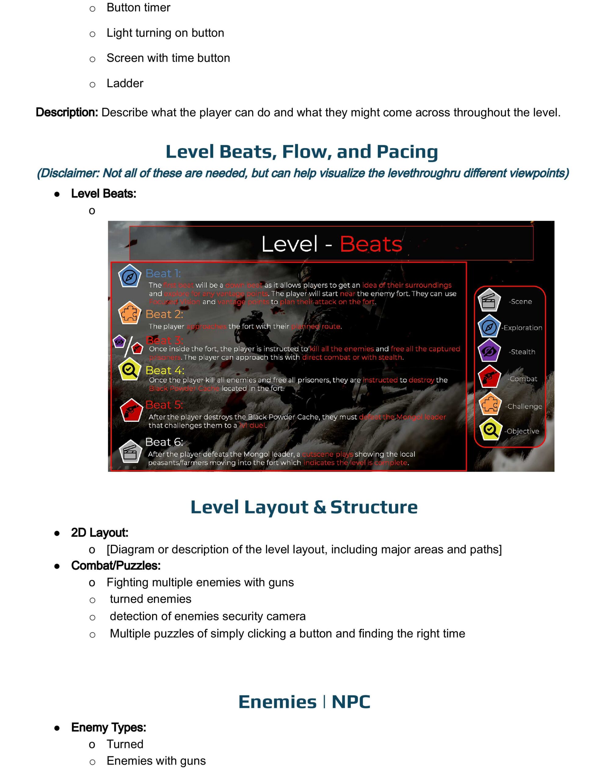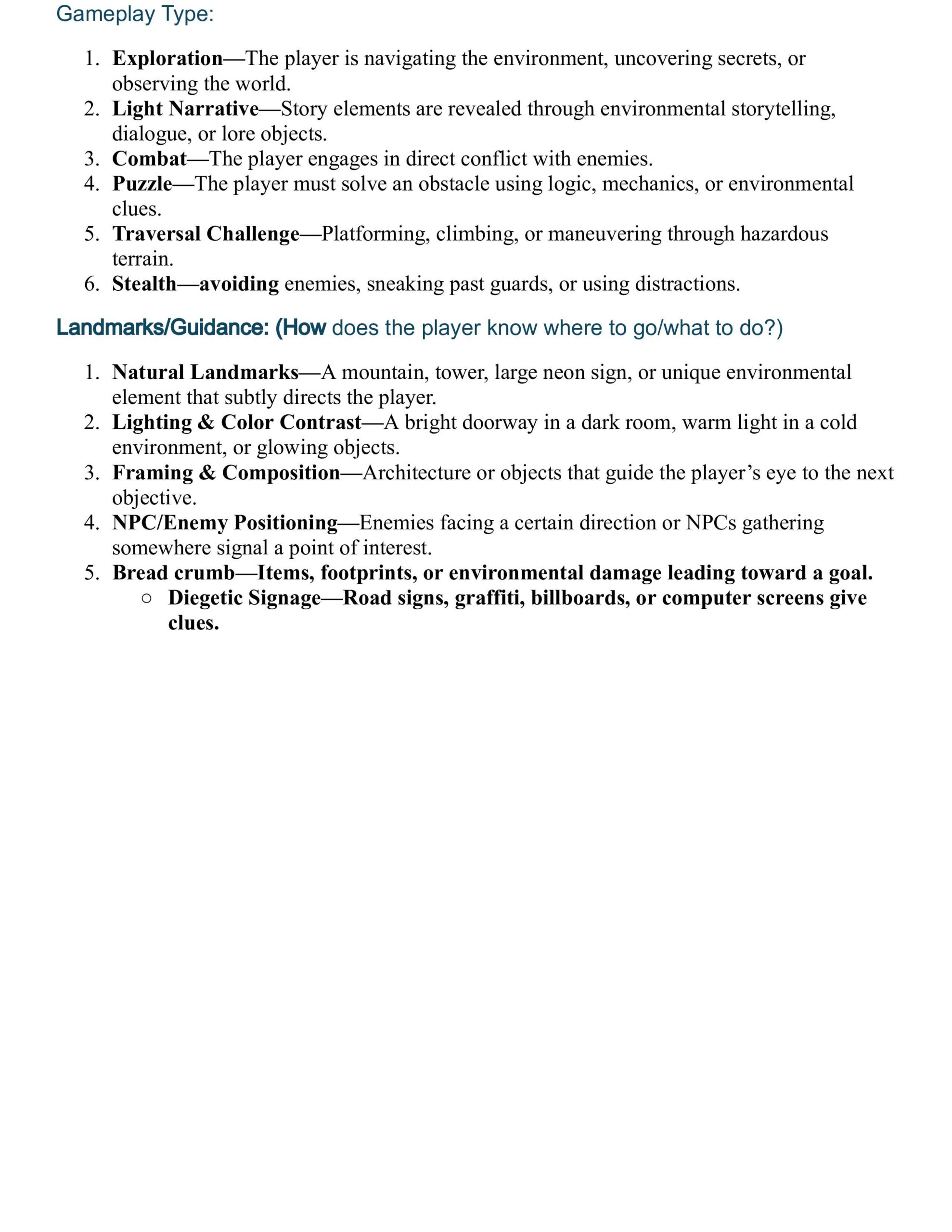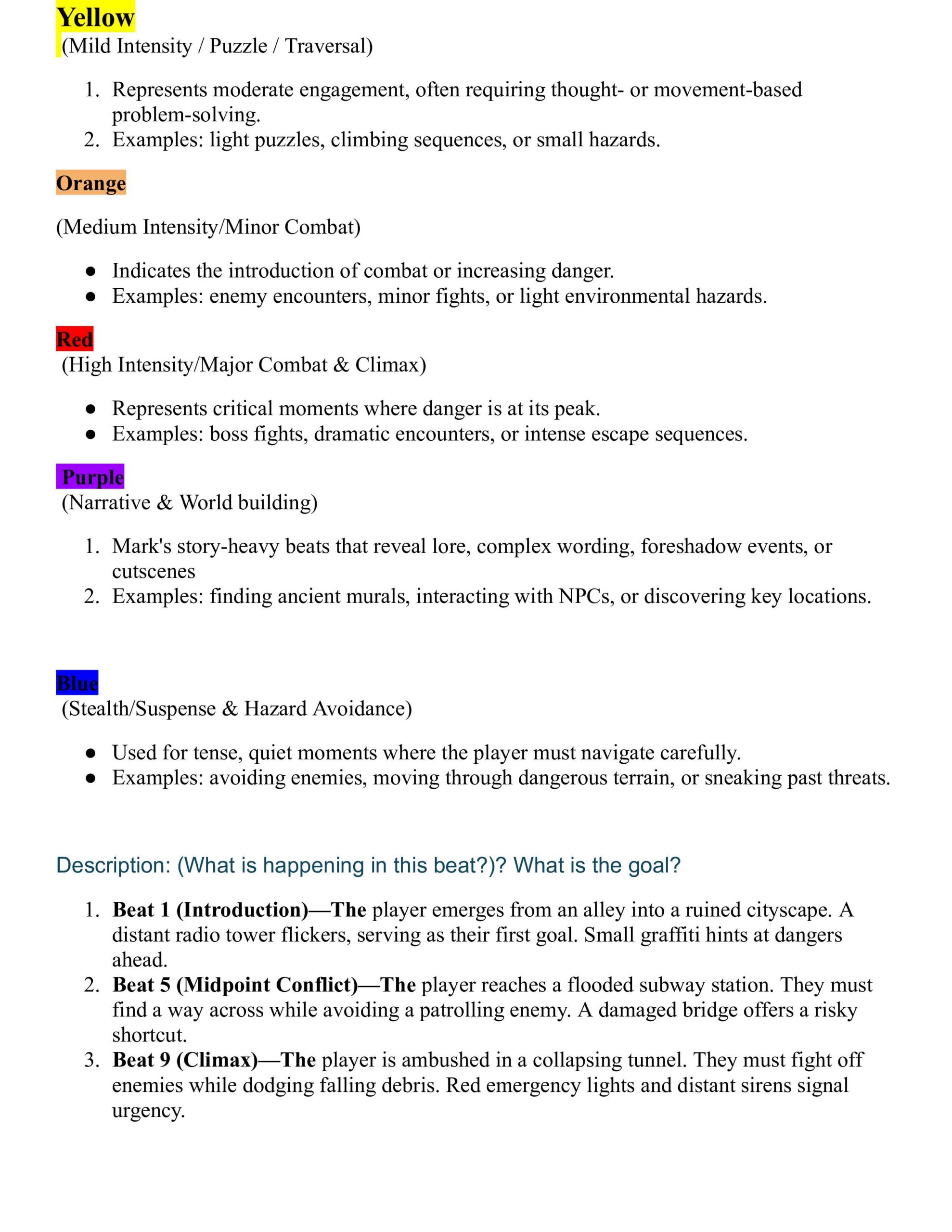 Breaking the level into smaller segments significantly improved my development process. Each section included descriptions of landmarks, player interactions, and the mechanics I would use—such as stealth, narrative moments, combat, or boss encounters. I kept the total number of beats under ten to maintain a clear, focused structure for my level.