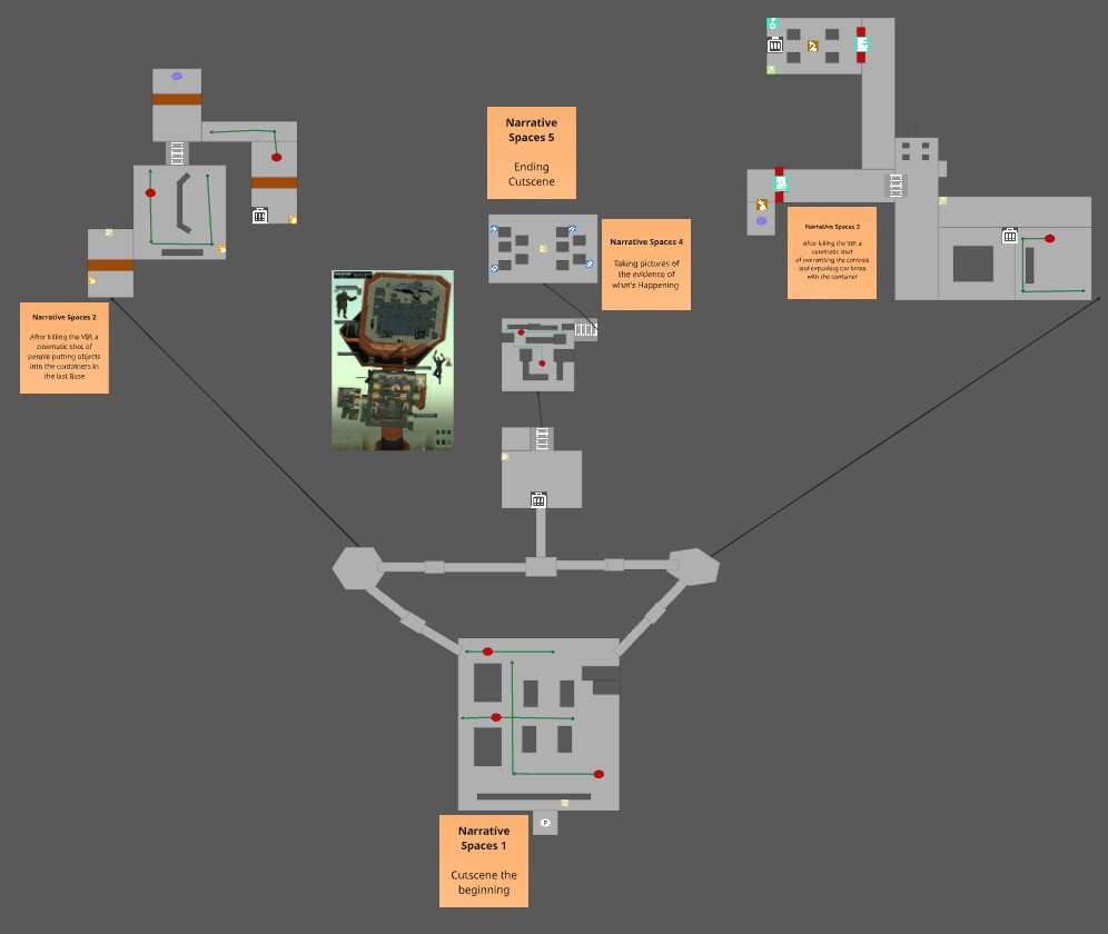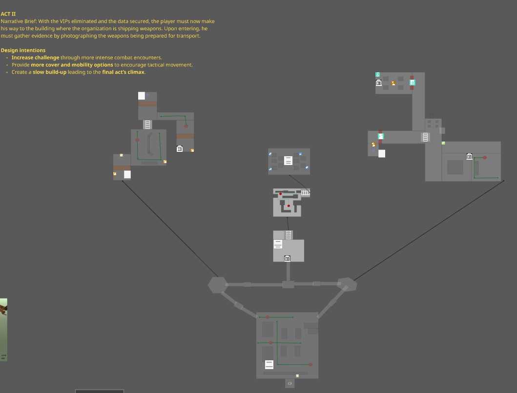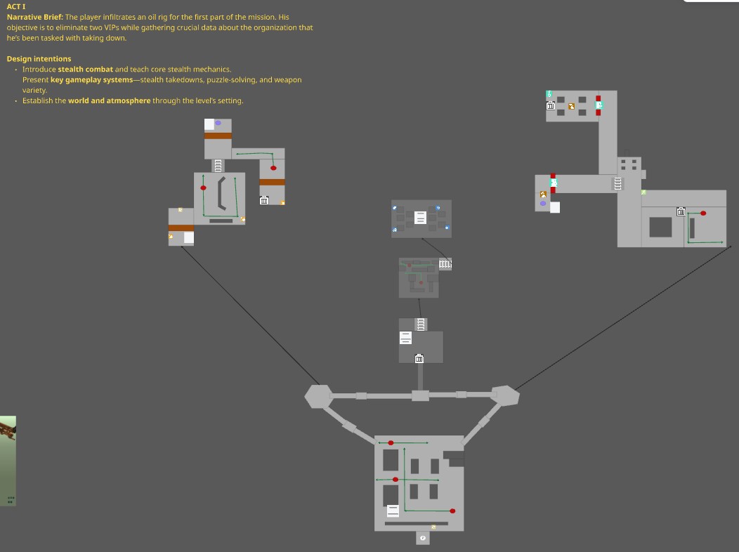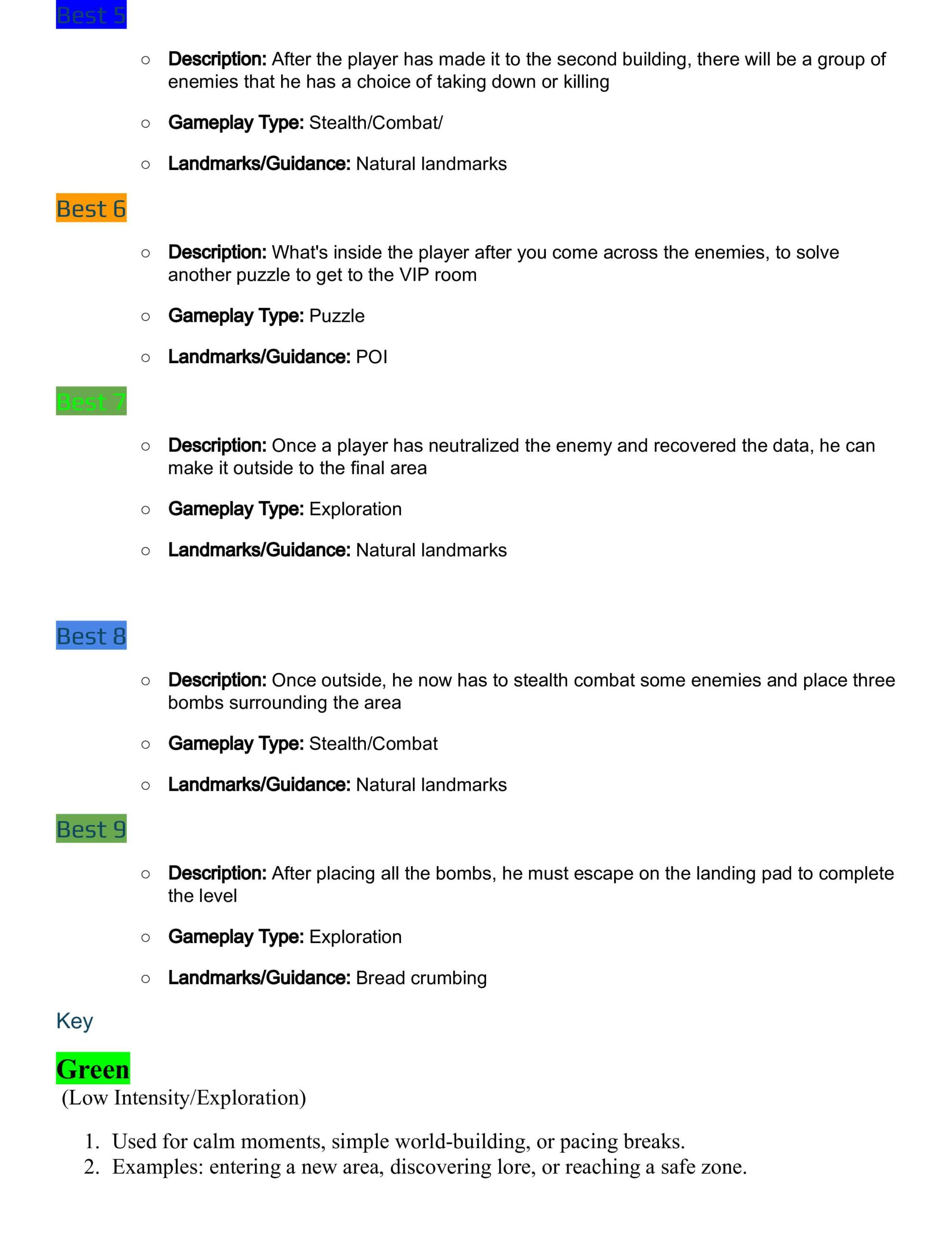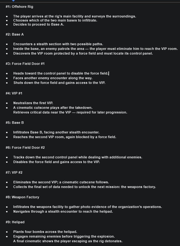 Breaking the level into smaller segments significantly improved my development process. Each section included descriptions of landmarks, player interactions, and the mechanics I would use—such as stealth, narrative moments, combat, or boss encounters. I kept the total number of beats under ten to maintain a clear, focused structure for my level.
