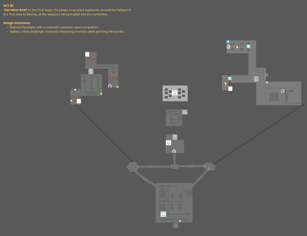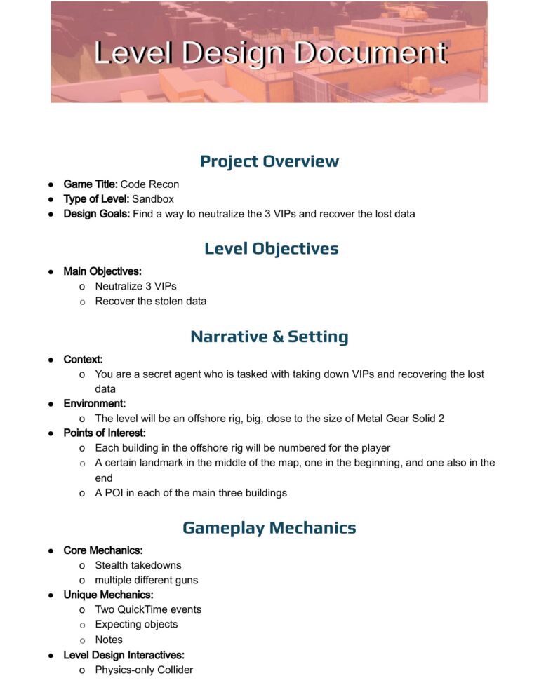 The Level Design Document served as my golden rulebook for the level. It included details such as environmental points of interest, core and unique mechanics, as well as a section for enemy types and the weapons they would use. This document helped me maintain a clear and consistent vision throughout the design process.